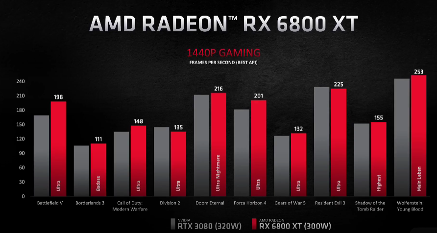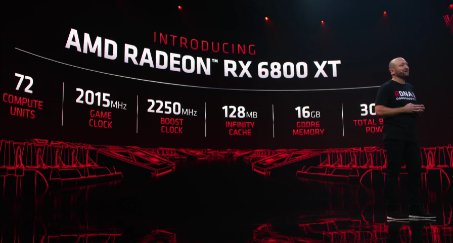 The Radeon RX 6800 XT features 72 compute units, carries 2015MHz game clock and 2250MHz Boost clock with 128MB infinity cache along with 16GB GDDR6 Memory. While it only takes 300w power draw, which is slightly lower compared to RTX 3080.
