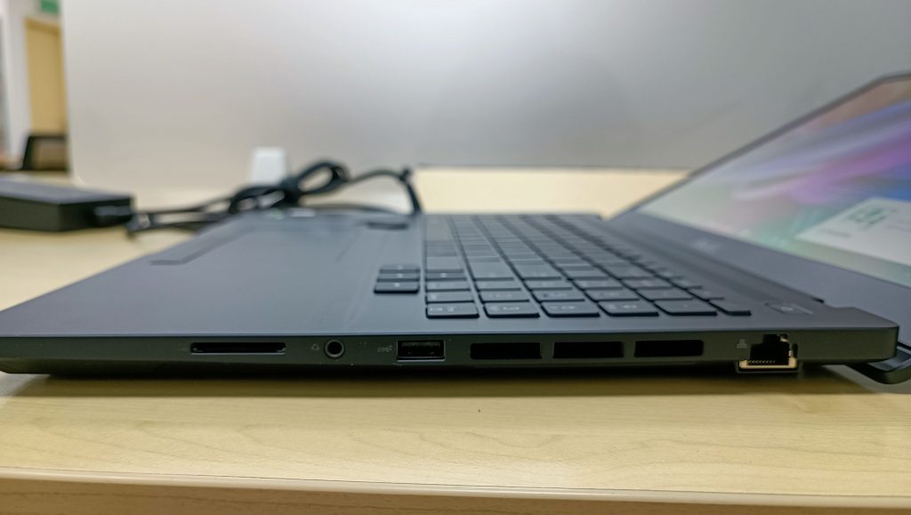 Over on the left side of the laptop you will spot 1 AC adaptor port for charging, two USB C port and a HDMI port. On the right side you have two USB 3 ports, a 3.5mm microphone/headphone jack, LAN Port and a SD Card Slot. There is no additional ports or slots at the back of the laptop but there is venting for dissipating the heat.