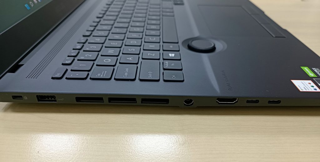 There is two things we will talk about when comes to this Laptop. The first is the Asus Dial, which is a knob that gives additional control located beside the touchpad on your left. As default you can use it to control brightness and volume in Windows 11, but when using specific applications from Adobe, such as Photoshop, it will act as an additional mostly used tools such and zoom or brush types which makes life easier especially for the content creators.