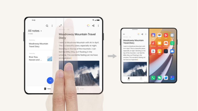 OPPO developed a series of custom software features for foldable devices, such as the two-finger split-screen, to make the most of the large screen. Users can split the screen into two for multitasking by simply swiping down the middle of the screen with two fingers.