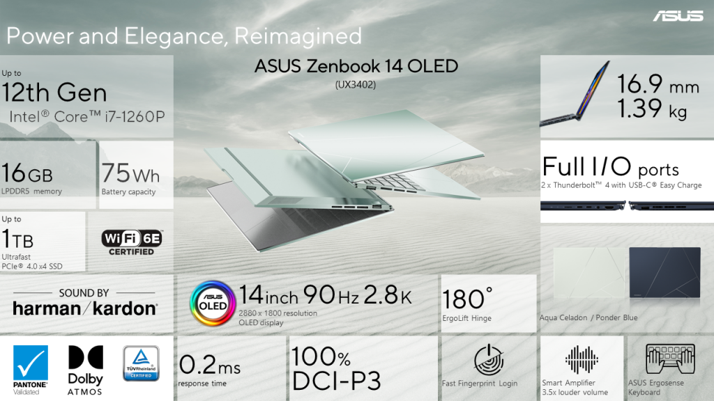 ASUS Zenbook 14 OLED (UX3402) will be available at RM 5,599 (Ponder Blue: i7-1260P/16G/1TB) and RM 4,399 (Ponder Blue, Aqua Celadon: i5-1240P/16G/512GB) in Malaysia.