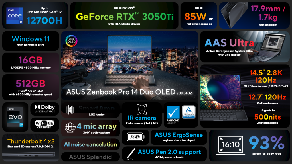 ASUS Zenbook Pro 16X OLED (UX7602) will be available for RM11,999 (i7-12700H/16G/1TB/RTX3060), while the ASUS Zenbook Pro 14 Duo OLED (UX8402) is priced at RM8,999 (i712700H/16G/512GB/RTX3050Ti)
