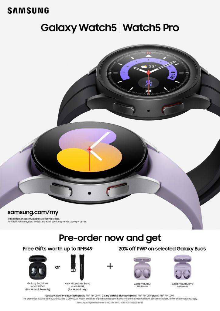 Not only that, but Pre-order the latest Galaxy Watch5 or Galaxy Watch5 Pro during the pre-order period to receive complimentary gifts worth up to RM549 and the Galaxy Buds2 Pro to receive a complimentary gift worth RM99! For more information, see the table below.