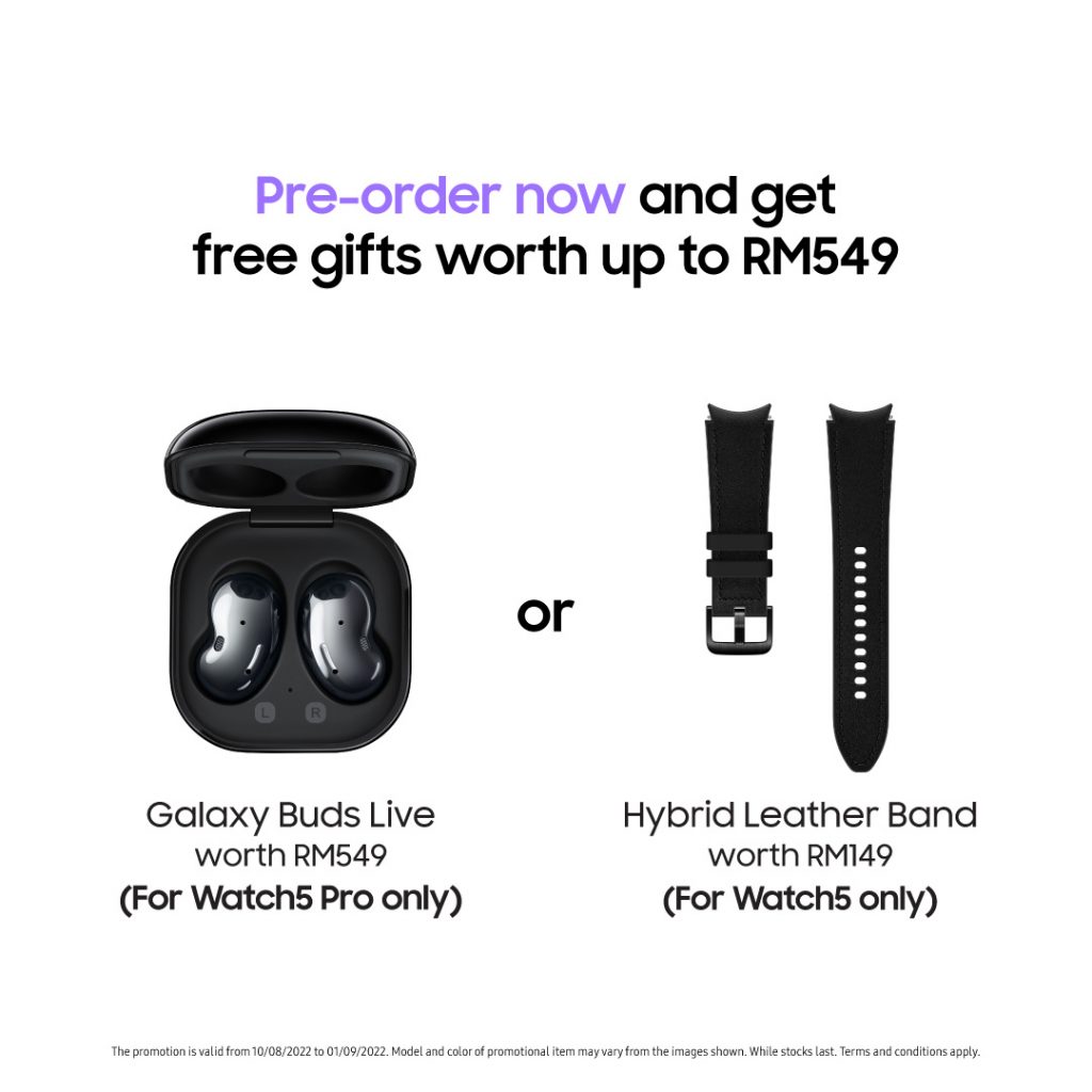 Be one of the first to own the latest premium Galaxy Watch5 series and seize the deals by pre-ordering them now from Samsung Experience Stores, Samsung Authorized Partners or Samsung Malaysia Online Store. Customers who pre-ordered the Galaxy Watch5 series by 1st September 2022, will be entitled to exclusive gifts worth up to RM549, which are – the Galaxy Buds Live for Galaxy Watch5 Pro customers, and the chic Hybrid Leather Band for Galaxy Watch5 customers. What’s more, customers will also get to enjoy 20% discount off PWP on the latest Galaxy Buds2 Pro and other selected Galaxy Buds models!