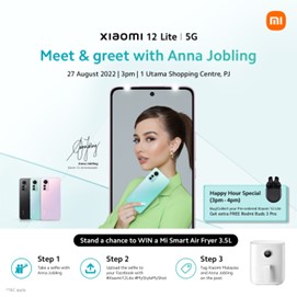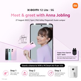 Fans and customers may meet Xiaomi 12 Lite brand ambassador Anna Jobling in person on 27 August between 3PM and 5PM at Xiaomi Stores in 1 Utama Shopping Centre, PJ and Mid Valley Megamall, KL. By just snapping a photo with Anna Jobling and publishing it on Facebook, you may win a Mi Smart Air Fryer 3.5L by visiting any of the two Xiaomi stores during the meet and greet session.