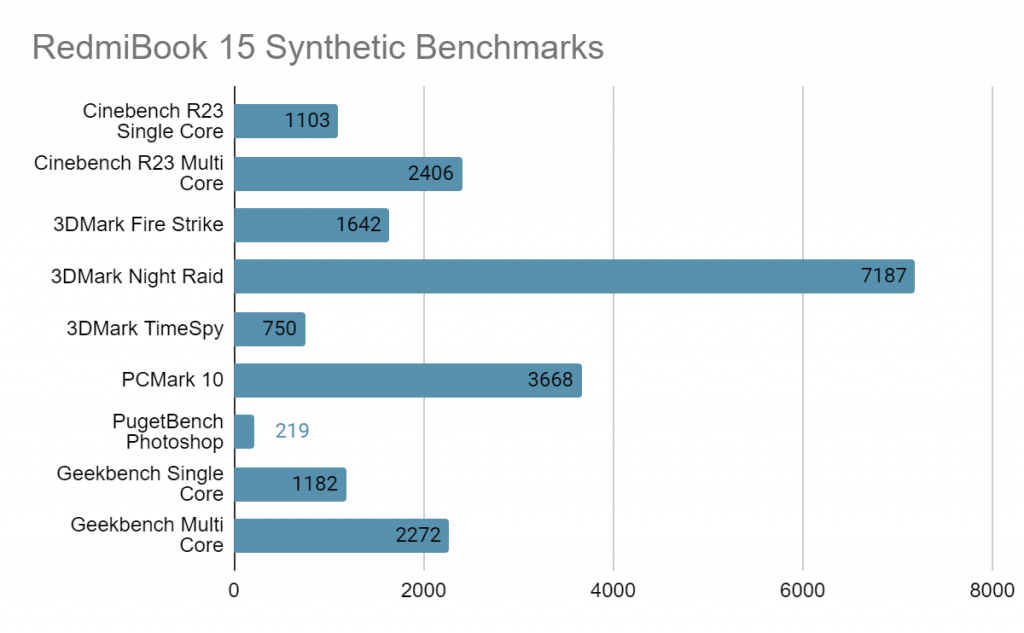 We find that the RedmiBook does a good job on synthetic benchmarks within the surrounding price and category, specifications around it. The multi threaded processor does help a lot in most of the tests but lacks in one portion, the SSD is still on SATA mode while the RAM configuration is set at Single Channel mode without an option to upgrade the RAM portion.