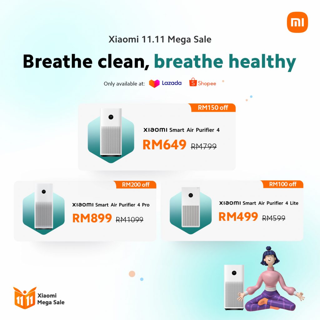 | Xiaomi Smart Air Purifier 4 | RM 799 | RM 649 | Lazada | Shopee |