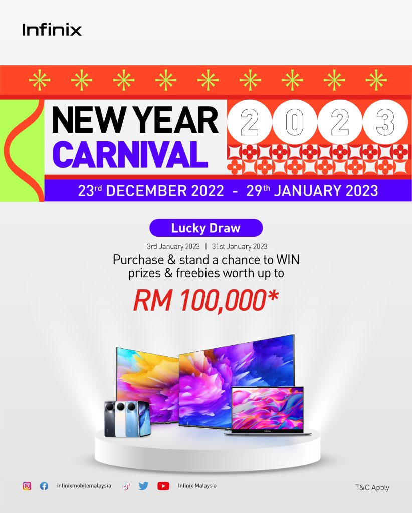 With its New Year Carnival 2023, Infinix Malaysia is spreading joy and happiness this upcoming New Year, offering consumers and Xfans nationwide freebies and prizes worth up to RM100,000. From December 23, 2022 to January 29, 2023, Malaysians can visit any of the 53 participating stores, purchase any Infinix product, and enter to win exciting lucky draw prizes.
