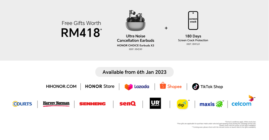 The HONOR X9a 5G, which is available at a low price, is designed to democratise flagship features for customers all around the world. Starting on January 6th, 2023, HONOR Malaysia will release an Ultra Noise Cancellation Earbuds, HONOR CHOICE Earbuds X3, and a 180-day screen crack protection.