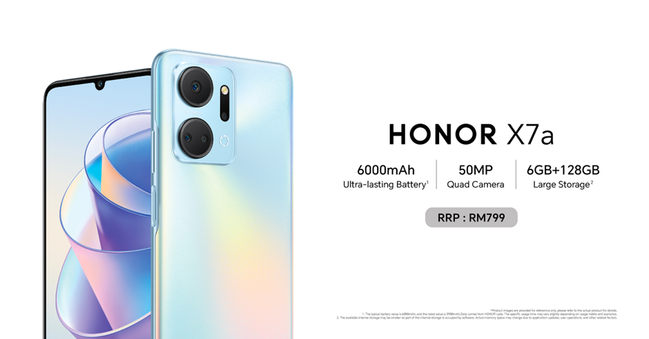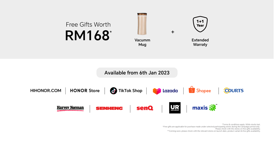 HONOR X7a will be available nationwide start from 6th Jan 2023 at price of RM799. Grab it during first sale period to get free gifts worth up to RM168, including vacuum mug and 1-year extended warranty.
