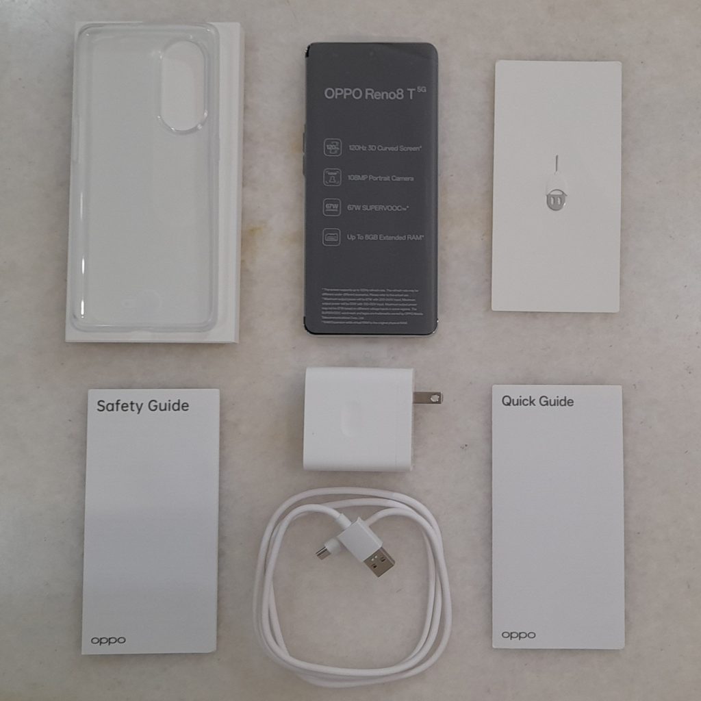Unboxing the package will review the OPPO Reno8 T 5G situated right in it. Other than the unit there’s also a rather welcoming addition: The charger plug along with the USB cable. Now, what is so special about the charger? Well, as here’s a little caveat emptor for you all, some lower-tier and midrange phones nowadays have already decided to negate the inclusion of a charger and even the USB cable, having to argue that cable and charging plug could easily be found anywhere and everywhere, so it is financially (and budgetarily) sound for most tech organisations to disclude these complementary items. Of course, they do have a point, and that is why having the plug and cable included is still a favorable move among us consumers.