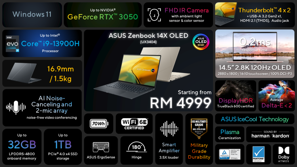 The 13th Gen Intel Core i7-13700H-powered ASUS Zenbook 14X OLED (UX3404) in both Inkwell Gray and Sandstone Beige are already available for purchase, priced at RM5,999. The other variants will be arriving on shelves by early April, with the Core i5-13500H variant priced at RM4,999, and the top-of-the-line option, featuring the Intel Core i9-13900H and GeForce RTX 3050, priced at RM6,999.