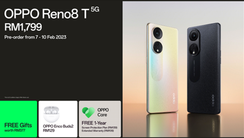 Reno8 T 5G will be on sale for RM 1,799 in Sunrise Gold and Midnight Black on February 7, 2023. Customers who preorder the Reno8 T 5G will receive free gifts worth RM 377, including the Enco Buds2, a one-year screen protection guarantee, and a one-year extended warranty. Pre-orders may be placed at any My OPPO Space, OPPO Brand Store, OPPO Official Online Store, E-comm partners, or authorised dealers.