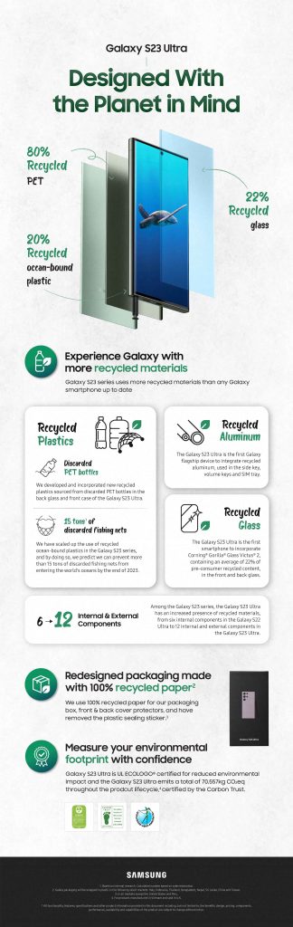 The Galaxy S23 series sets new standards for both quality and aesthetics while having less of an impact on the environment than earlier generations. To do this, we used 100% recycled paper to construct the packing box and used recycled materials in more device components than in any prior Galaxy smartphone before. The amount of recycled materials has also grown in the Galaxy S23 series, going from six internal eco-friendly components in the Galaxy S22 Ultra to 12 internal and exterior recycled components in the Galaxy S23 Ultra.