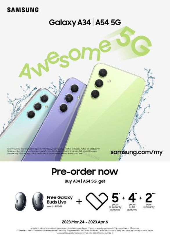 Pre-order the Galaxy A54 5G and Galaxy A34 5G via Samsung Experience Stores, Samsung Authorised Retailers and Samsung Online Store from 24 March to 6 April 2023 to get a free Galaxy Buds Live worth RM549 and 2 Year Extended Warranty.