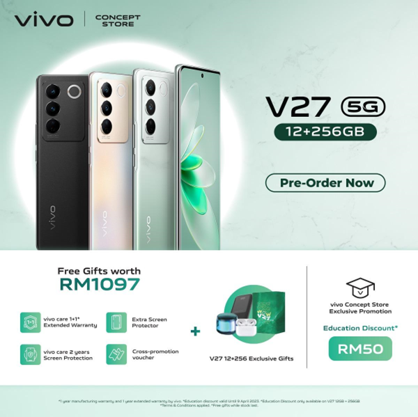 vivo V27 is available for pre-order now until 31 March at any vivo concept store. Consumers who purchase vivo V27 12+256GB are entitled for free gifts worth up to RM1097.