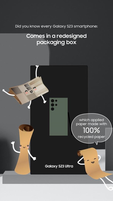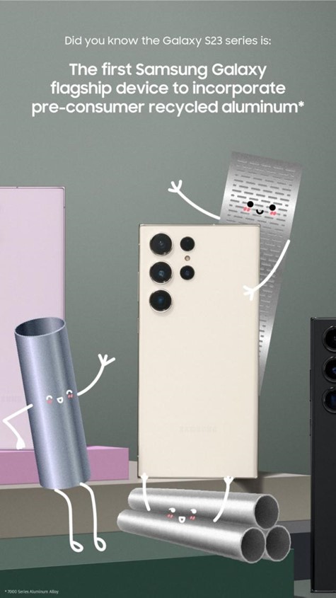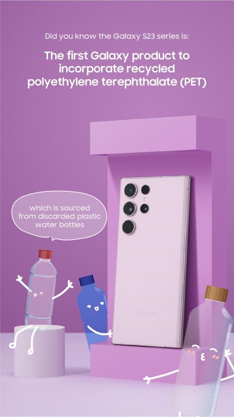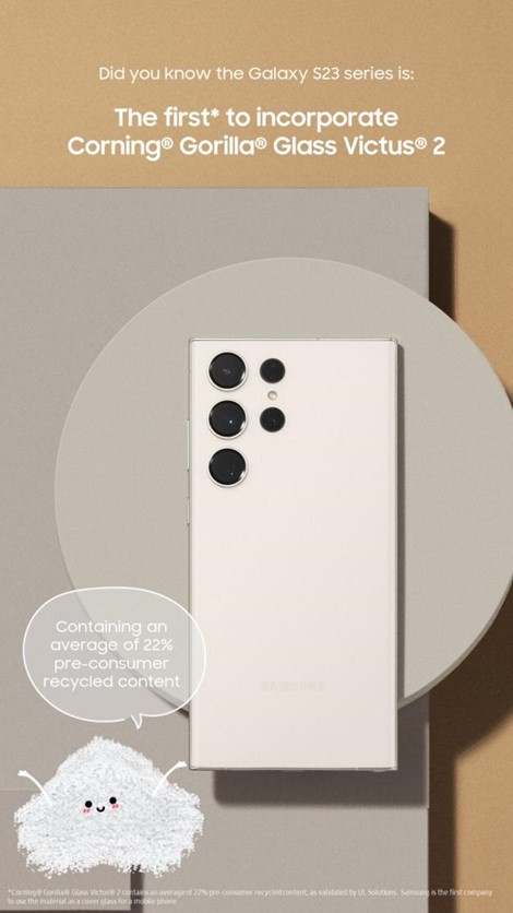 The Galaxy S23 series is UL ECOLOGO® certified, resulting in a lower environmental impact while still delivering the best of Samsung Galaxy innovation. Learn how the Galaxy S23 series employs recycled materials in more device components than any other Samsung Galaxy smartphone to set a new standard for quality and aesthetics while having a lower environmental effect.