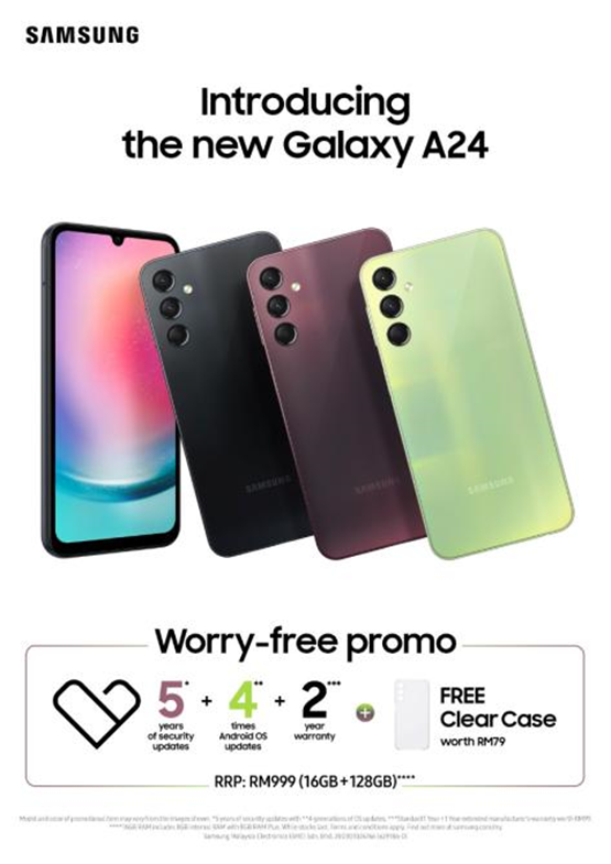 Purchase the Galaxy A24 between now and May 31, 2023, and you will receive a free 1-year extended warranty1 worth RM99 as well as a free transparent case worth RM79.