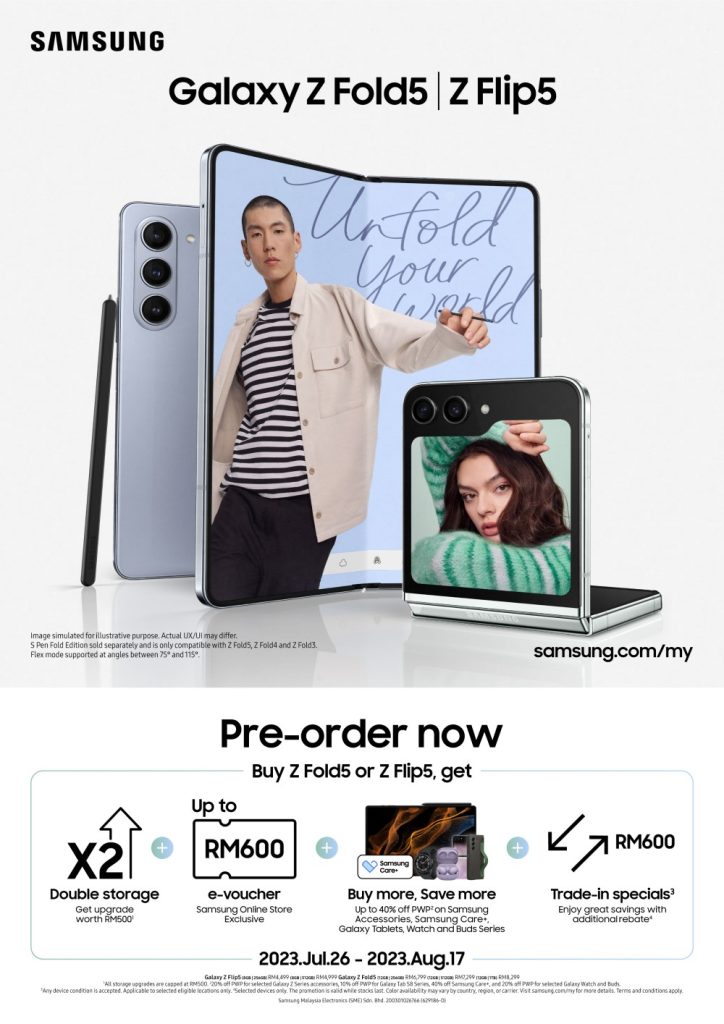 Pre-orders will be available from July 26 to August 17, 2023. The Galaxy Z Fold5 starts at RM6,799 and the Galaxy Z Flip5 starts at RM4,499 respectively. Remember to use the e-voucher worth up to RM400 that you received when you registered your interest.