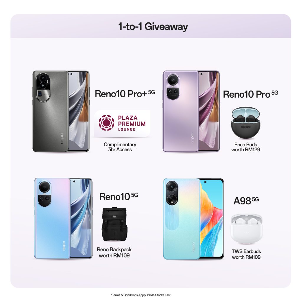 | OPPO Reno10 Pro 5G | RM2,199 | Free Enco Buds2 worth RM129 and 1-Year Extended Warranty |