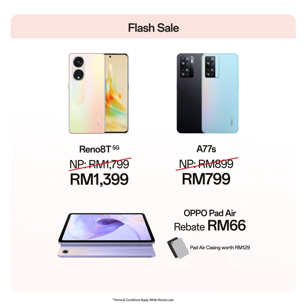The much-anticipated Flash Sale has arrived, providing shoppers with the opportunity to save big with jaw-dropping reductions of up to RM400. This deal is your golden ticket to the OPPO Reno8 T 5G with a 108MP portrait camera, the OPPO A77s with a long-lasting battery and rapid charging, or the OPPO Pad Air for working, learning, and entertaining. Don’t pass up the opportunity to save money while enjoying high-quality items.