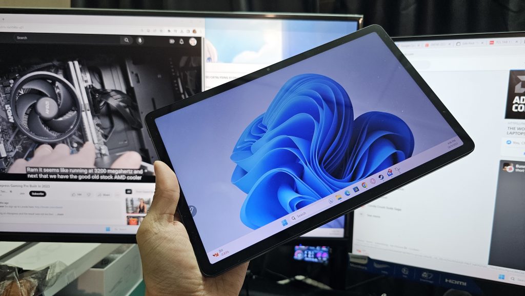 The design brings in the element of aluminum mixed with plastic that covers most of the body of the tablet. The strips of antenna is located just beside the rear camera, and this is a smart move as when holding the tablet, the antenna is facing upwards and therefore giving an advantage towards network and transmissions for 4G and WiFi. The overall weight is just around 462 grams and the thickness is measured at 6.9mm, making it fairly easy to operate and hold on it, also in part thanks to the rightly sized bezel on the screen. The camera bump is not that intrusive, with that said you can lay almost flat on any surface, or just use the included tablet cover in the box.
