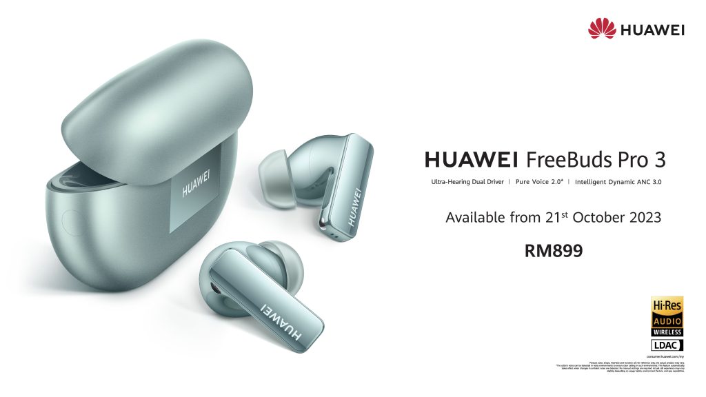 HUAWEI FreeBuds Pro 3 is known as the new generation of ultimate acoustic flagship TWS earbuds that balances design aesthetics with class-leading audio technology, enhancing the audio experience for users accustomed to finer living and will be available on 21 October 2023 for RM 899 on Huawei Experience Store, Huawei Official Website, Huawei Official Store on Shopee, and Huawei Flagship Store on Lazada.