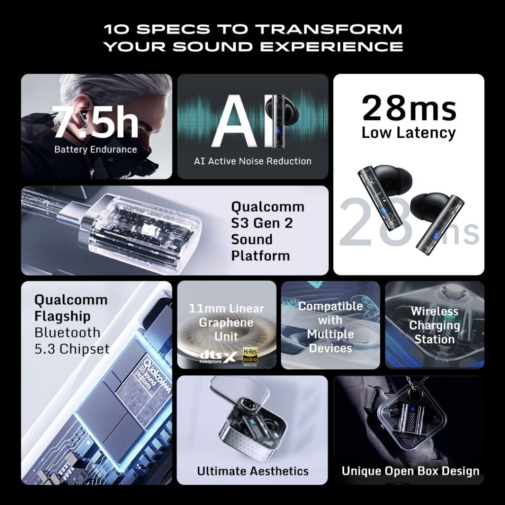 Users may change the RGB light effects and sound options to improve their gaming experience in various circumstances. The earbuds and charging base feature a contemporary transparent design that highlights cyber technology with stunning RGB light effects and sci-fi sensations. When linked to a smartphone, an application named “Goper” is accessible in the PlayStore and will soon be available in the App Store, allowing users to handle features such as codec format (SBC, AAC, LE Audio, aptX, and LHDC 5.0), audio EQ settings, gaming modes, lighting effects, and even pop-up window pairing.