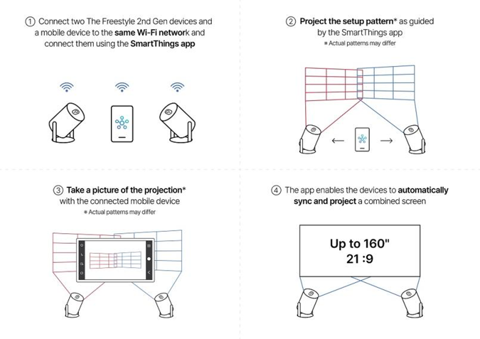 When Smart Edge Blending is activated, the connected smartphone will engage with The Freestyle portable projectors in real time. Content sync and adjustment processes take place automatically via communication between the devices. “Screen alignment can easily be done using the SmartThings guide when a user captures a picture of the projected screen. The analytic algorithm will analyze the span and overlap of the patterns at eight main points on the setup screen and then adjust the projection on each device,” he explained.