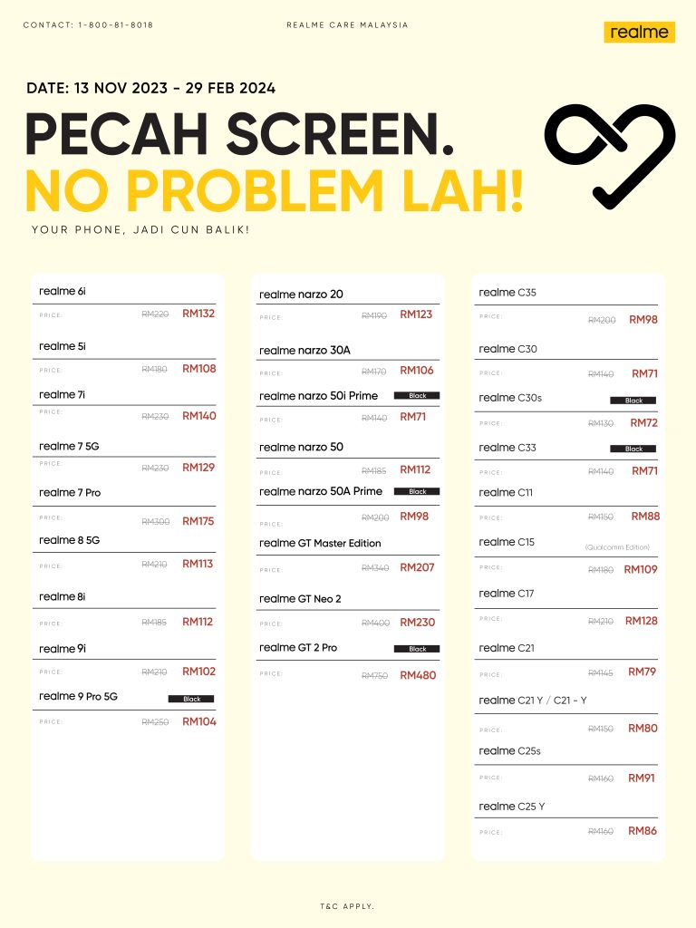 realme Malaysia is offering cost-effective screen repairs for realme smartphones countrywide as part of its commitment to provide a great after-sales experience. This special promotion will continue from today until 29 February 2024, and will allow realme users to save money on screen repairs at realme Exclusive Service Centres and Authorised Service Points. This project reflects realme Malaysia’s commitment to customer happiness by providing realme smartphone users with low-cost, high-quality screen repair services.