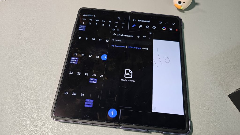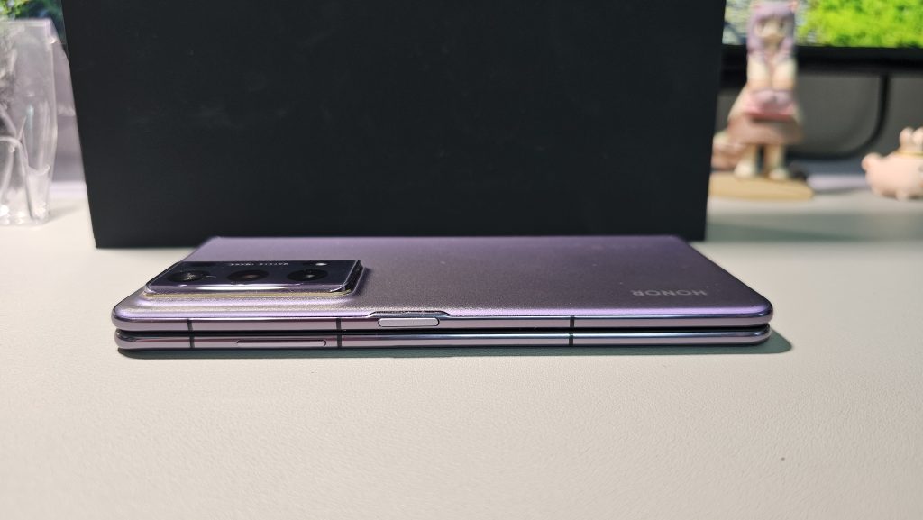 Lets talk about the body, the back of the phone is made of glass or PU leather (depending on the color you choose), while the hinge is made of titanium with gearless hinge opening and closing, no frictions and thus making it easy to fold and unfold without any weird creaking noise. In the end it is creaseless and you would felt the lines if you put some light pressure to it, otherwise all your day to day operation with it should be smooth and you hardly can notice the crease in the middle. HONOR claims that the hinge can last for an approximate of 400k times or to translate in years, that would be 10 years of overall average operational usage before things starts to get loose.