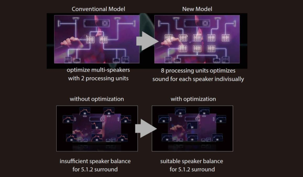 - Enhanced audio processing for an expanded 8-channel setup, optimizing each speaker for improved clarity and precise sound positioning.