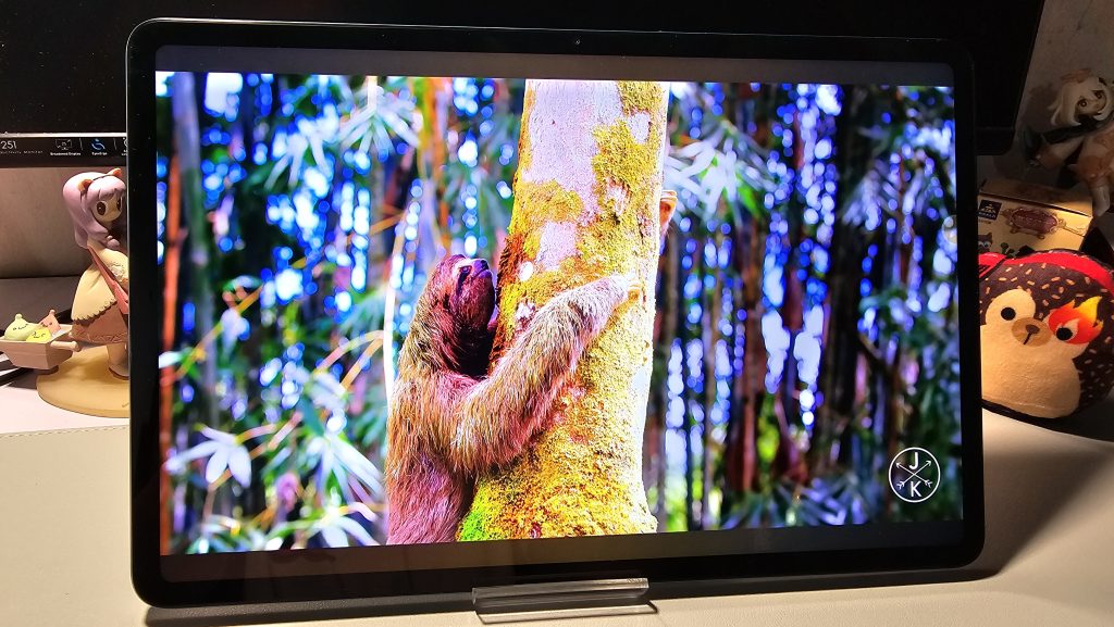 The HONOR Pad 9 weighs about 555 Grams, slightly heavier than other competitors, with a thickness of only 7mm, making it easy to hold as a tablet. There were a few subtle alterations made to the design base, with the camera now positioned in the top center of the tablet. When you look at the screen, you will see a 12.1 inch, 120Hz 2.5K Dynamic LCD screen with 88% screen to body ratio, providing a pleasant viewing experience with slim edge bezels that make it easy to hold without affecting the display. This is also supported by the SGS Eye Care certification, Dolby Vision, Circadian Night Display, symmetrical rounded edges, and smooth touch on the back of the tablet for display protection.