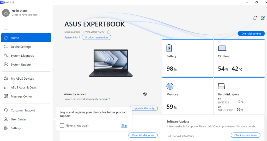 Naturally the ASUS Expertbook B1 B1402 came with Windows 11 Pro out of the box, with Microsoft Office pre-installed however you will need to purchase or subscribe to Microsoft Office 365. Apart from that there is only a few pre-installed ASUS apps, namely ExpertWidget that allows you to assign Hotkeys, MyAsus for firmware, software updates and system diagnostics, and lastly the ASUS Business Manager for managing installed software and IT organization management.