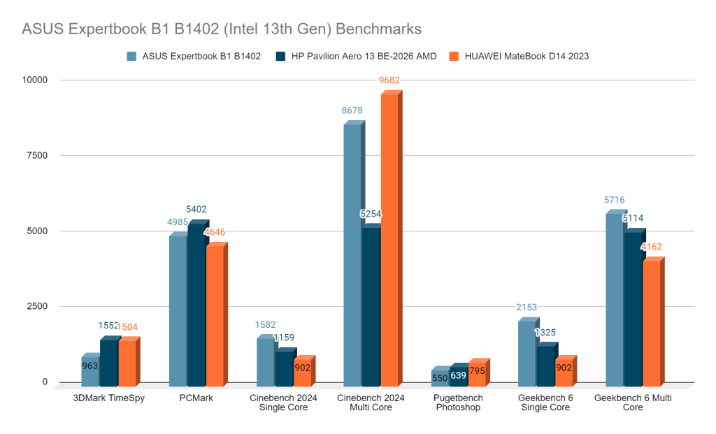 Powered by the Intel Core i5 1335U, along with 8GB of DDR4 RAM and 512GB of NVME Gen4 storage, the ASUS Expertbook B1 B1402 specification is modest enough for all your daily usage. With the supplied 42Wh battery, the laptop can easily last you up to 7 hours of typical work, multimedia and browsing usage moderately. A 65w USB type C charger is included in the box, so recharging it back from empty to full will roughly take about 2 hours, and charging is also compatible with any 65W charger, as long it is a PD charger.