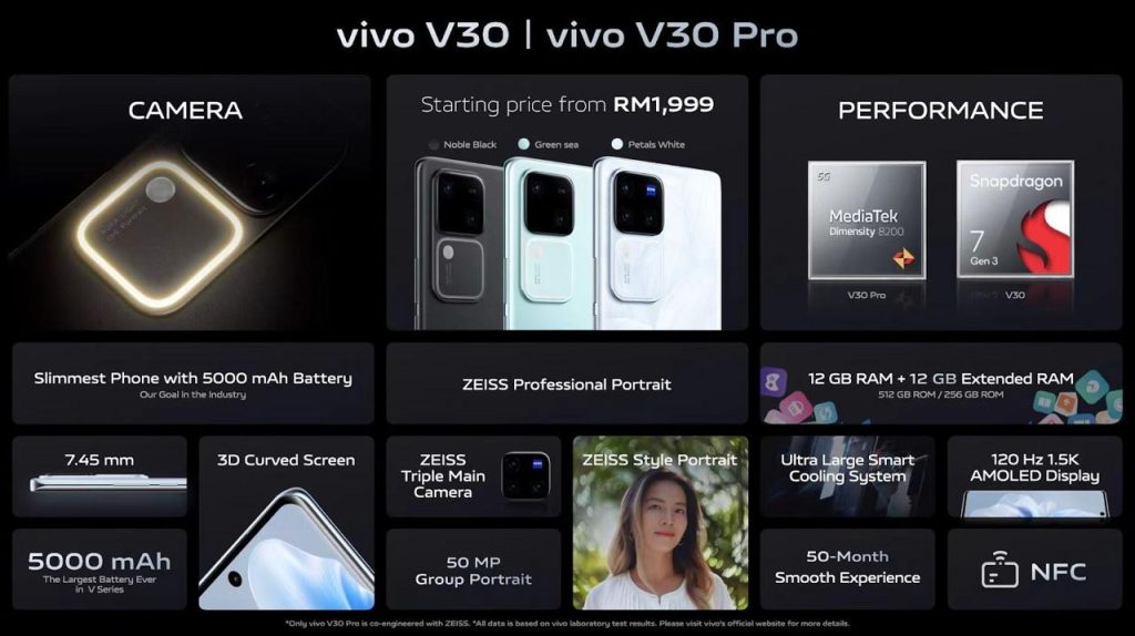 The vivo V30 series introduces a groundbreaking imaging revolution powered by ZEISS, featuring the Aura Light Portrait 3.0 for precision akin to studio photography in portrait shots. With enhanced hardware and software, including a Triple Main Camera setup in partnership with ZEISS Optic for the vivo V30 Pro, users can expect top-notch photo quality and versatility. Despite its premium features, the series remains budget-friendly, with the vivo V30 priced at RM1999 and RM2199 for the 12+256GB and 12+512GB variants respectively, while the vivo V30 Pro is priced at RM2599. Fueled by the Qualcomm Snapdragon 7 Gen3 processor and Extended RAM 4.0 technology, the vivo V30 series offers smooth multitasking and powerful performance, setting a new standard for efficiency and responsiveness.