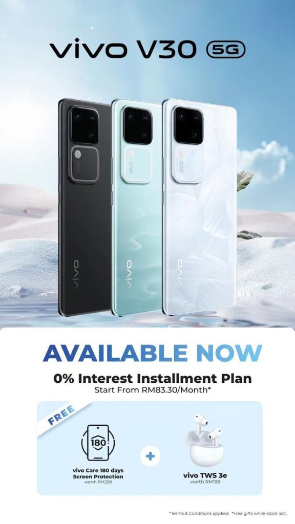 The vivo V30 series is now easily accessible with a 0% installment plan starting from just RM83.30 per month. Customers can seize this opportunity to enjoy exclusive freebies, including the vivo care 180 days Screen Protection worth up to RM299 and the vivo TWS 3e valued at RM199. vivo Malaysia encourages customers not to miss out on this golden opportunity to immerse themselves in the future of smartphone technology.