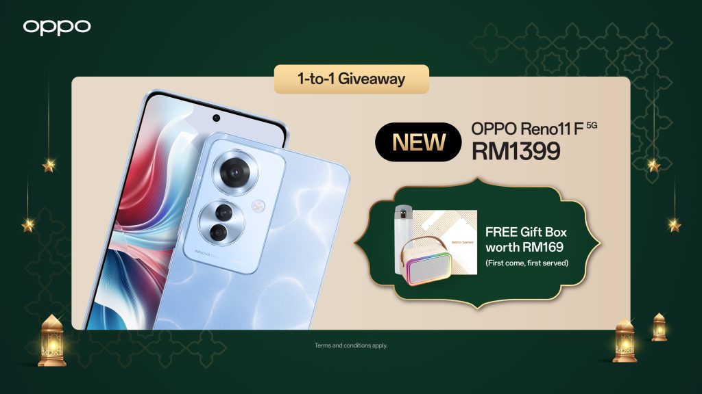 Purchasing the stylish OPPO Reno11 F will treat you to a complimentary gift box worth RM169. With its sleek design and advanced 64MP Ultra-Clear triple camera, the Reno11 F is your perfect companion for capturing memorable moments during Hari Raya.