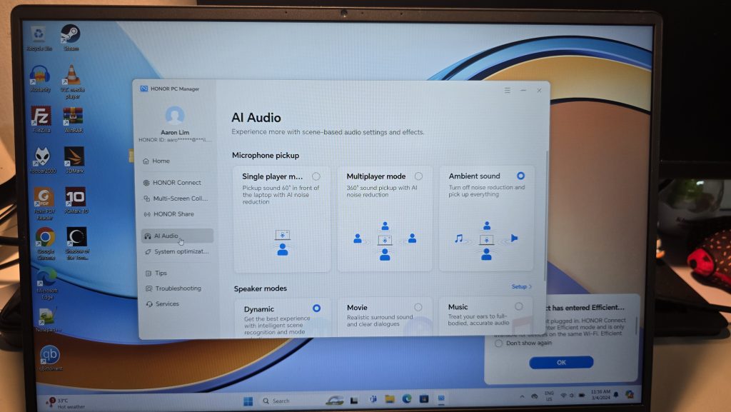 The dual speakers on the Magicbook X16 keeps gave a pretty good soundstage and all of these can be configured with selectable pre-sets from the PC manager, which allow you to select speaker modes and microphone adjustments, like multiple mode or ambient mode, which is highly suitable for office based online meetings and conferences