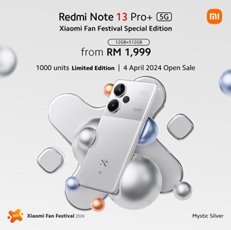 The Xiaomi Fan Festival Special Edition Redmi Note 13 Pro+ 5G (12GB+512GB) will be available from April 4 at all Authorized Xiaomi stores in Malaysia and online at official Xiaomi stores on Lazada and Shopee.