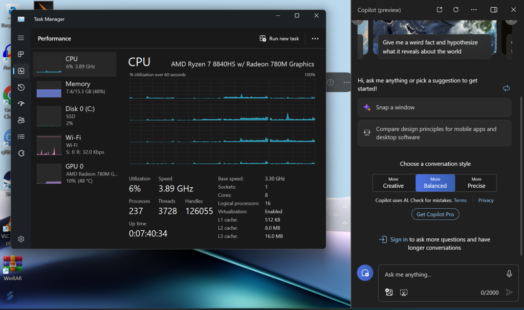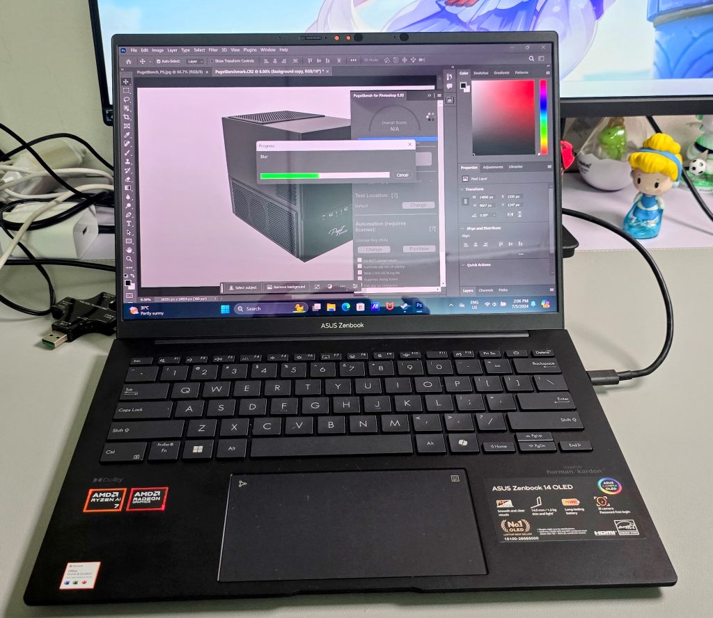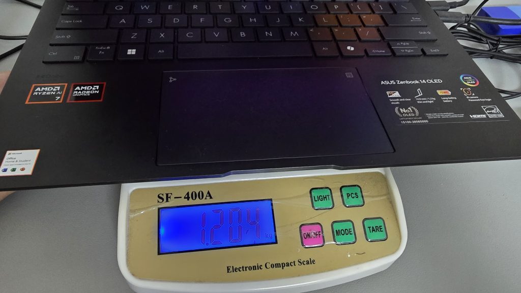 The ASUS Zenbook 14 OLED uses the latest APU from AMD, the AMD Ryzen 8840HS with integrated Radeon 780M RDNA3 graphics inside. Since this is part of the Ryzen 8000 series APU, it does have Ryzen AI inside, which is an integrated XDNA NPU that helps accelerate in AI related app tasks, such as Adobe Premier Pro and more apps are coming up supporting the NPU processing. It also comes with 16GB of LPDDR5X RAM at 7500Mhz and 512GB of Internal storage, which the only thing you can swap or upgrade is the internal storage, other than that all is soldered to the motherboard which is understandable since ASUS wanted to make everything as small and portable as possible.
