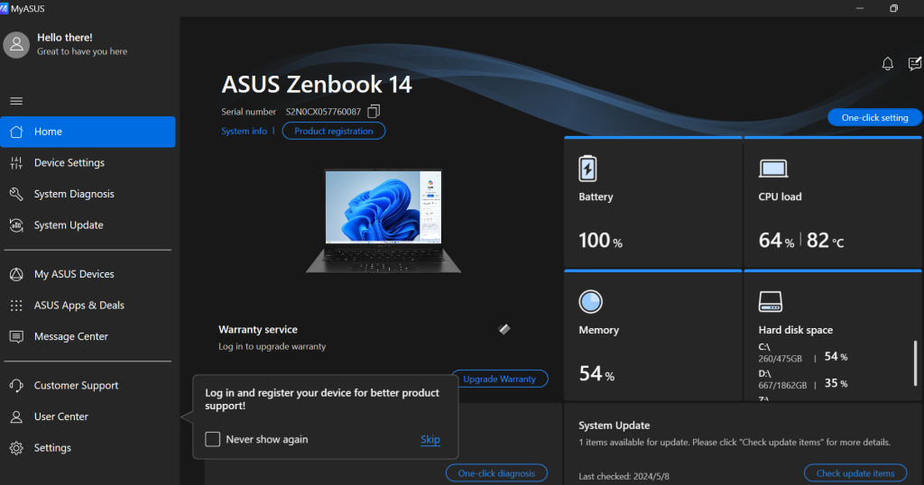 From what I see, there is no bloatware, apart from just the standard Windows 11 installation and Microsoft Office 365, and just MyASUS App and GlideX. MyASUS app is an one stop control centre for all your laptop monitoring and status, with additional features like viewing your warranty stats, system information, power setting, audio settings and so on. GlideX allows the user to share or extend your main screen with another mobile device, including phones as well as file transfer functionality.