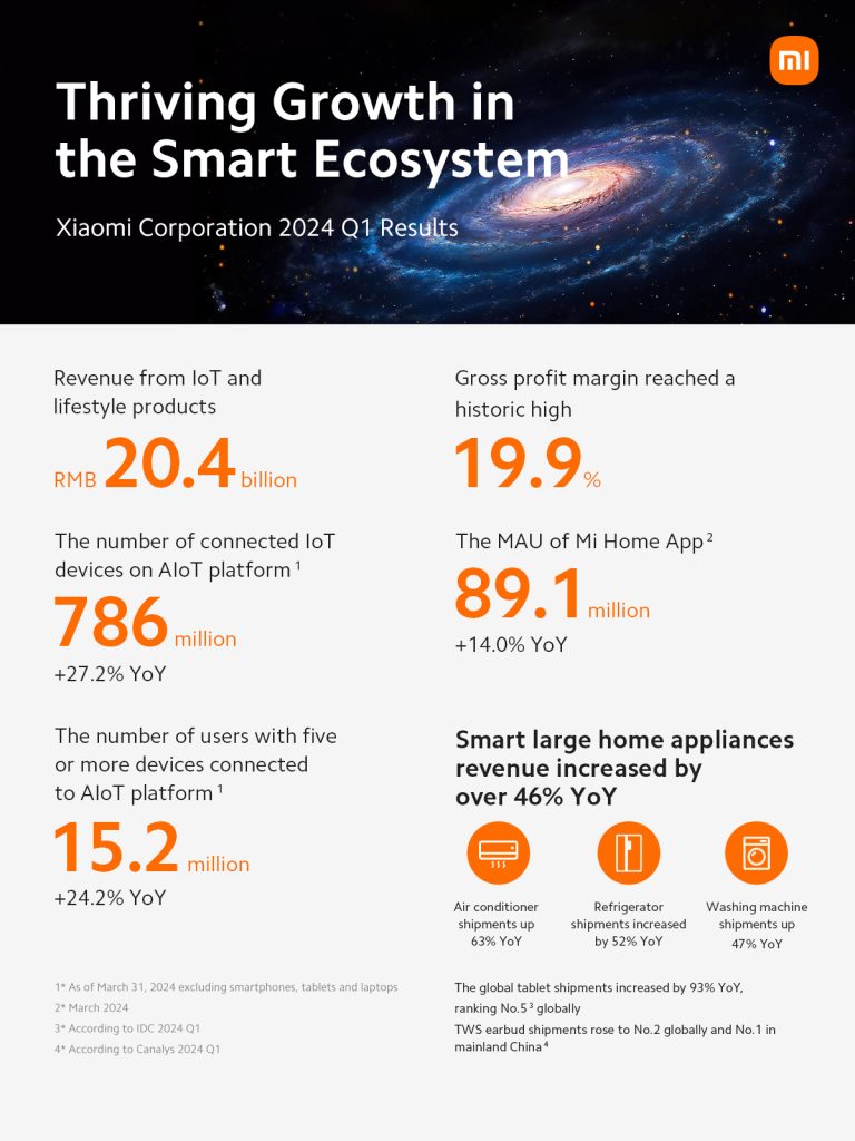 Xiaomi Corporation announced its unaudited consolidated results for the three months ended March 31, 2024. The Group reported substantial growth, with quarterly revenue reaching RMB 75.5 billion (approx. RM 49.8 billion), a 27% year-over-year (YoY) increase. Adjusted net profit surged by 100.8% YoY to RMB 6.5 billion (approx. RM 4.3 billion), despite RMB 2.3 billion (approx. RM 1.5 billion) in expenses related to its smart Electric Vehicle (“EV”) business and other new initiatives. Xiaomi’s gross profit margin improved to 22.3%, a 2.8 percentage point increase YoY.