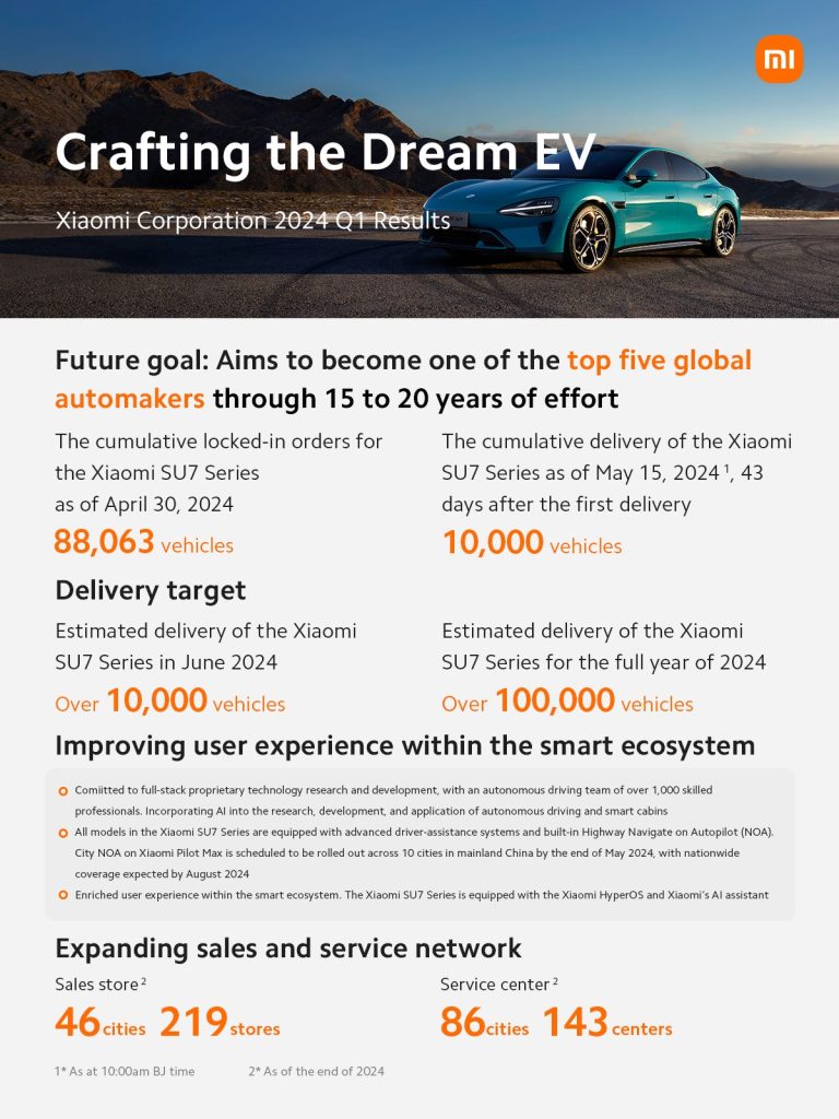 - Autonomous Driving: Achieved significant advancements in autonomous driving technology, with plans for nationwide rollout of City Navigate on Autopilot (NOA) on Xiaomi Pilot Max by August 2024.