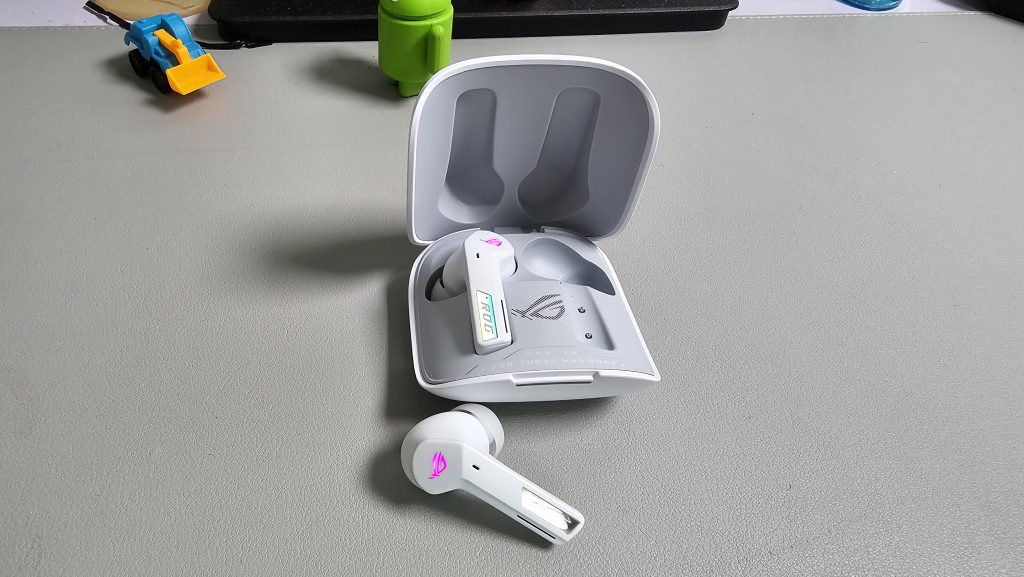 Starting from the charging case that holds the earbuds, the ROG Cetra SpeedNova TWS definitely signifies a gaming inspired design to it that is pod shaped, and still retains a small but recognisable ROG logo in front. Opening the case unveils the pair of earbuds with three ROG logo in RGB lights in total, one inside the case, and each side of the earbuds has the ROG logo also, which by the way is also the touch sensitive buttons, more on that in the control section.