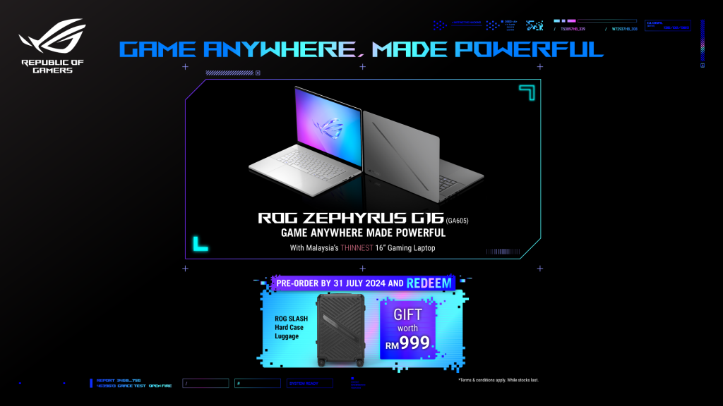 - Zephyrus G16: Pre-order to receive a ROG SLASH Hard Case Luggage worth RM999.