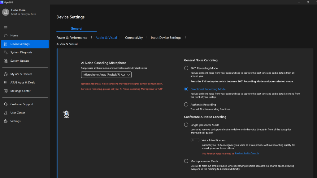 ASUS made sure to focus on the audio quality, with the stereo speakers positioned below the laptop delivering strong sound, good bass, and clear treble during our testing in a small room with strong vocal audio. You can customize the sound settings using the Dolby app and MyASUS app, which offer various environment modes tuned by Dolby Atmos and sound by Harmon/Kardon. The laptop is equipped with multi directional microphones, giving you the option to choose between default, focus on surrounding for group meetings, or self focus right in front of you with the laptop.