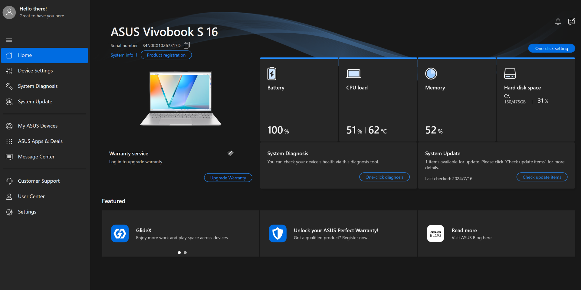 It seems like there isn’t any unnecessary software installed, except for the basic Windows 11 setup, Microsoft Office 365, MyASUS App, and GlideX. MyASUS App acts as a central hub for monitoring and managing your laptop, offering features such as checking warranty information, system details, power settings, and audio configurations. GlideX enables users to mirror or expand their screen onto a mobile device, including phones, and also allows for file transfers.