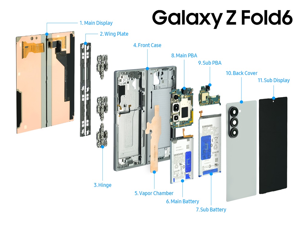 The Galaxy Z Fold6 uses a single-layer printed board assembly (PBA), which houses essential components like the processor and memory. This shift from a stacked, multilayer design to a single-layer PBA contributes to the device’s slim form.