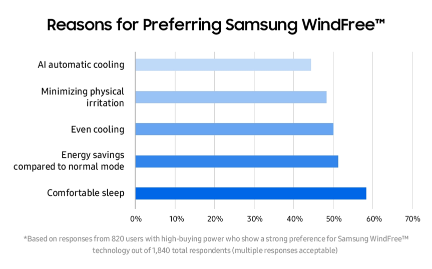 Samsung Newsroom delved into the reasons behind the global success of WindFree™ technology. A recent survey conducted by Samsung involving 1,840 respondents from Brazil, India, Italy, Korea, Thailand, and the United States revealed that 44.6% (820) of participants prefer WindFree™ air conditioning. Notably, 58% of these users cited “comfortable sleep” as the main reason for their preference. This indicates a growing expectation for air conditioners to provide more than just cooling, offering enhanced comfort tailored to different needs.